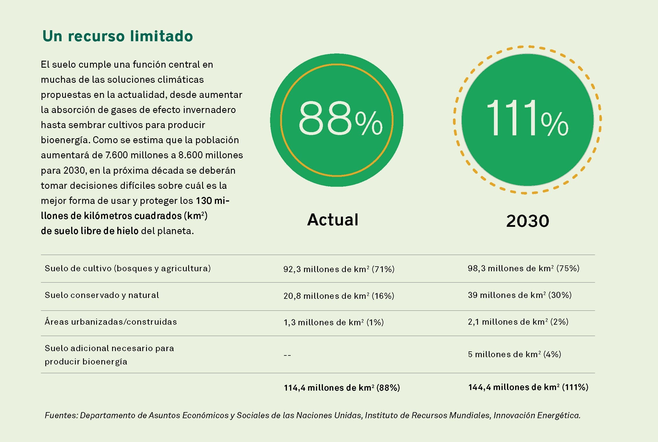 El suelo será la fuente de energía, en especial para la energía solar, eólica y de biomasa, necesaria para reemplazar los combustibles fósiles que actualmente satisfacen cinco sextos de la demanda energética mundial. Si bien el impacto de la energía solar y eólica en el paisaje no puede negarse, estas fuentes pueden ubicarse en áreas de usos múltiples. Por ejemplo, las turbinas eólicas y los paneles solares pueden instalarse en tierras agrícolas o en techos o estacionamientos en espacios urbanos. A diferencia de la energía solar y la eólica, la energía de biomasa, que se produce mediante materia prima agrícola en la forma de electricidad (bioenergía) o combustible (biocombustible), debe ubicarse en suelo productivo para la agricultura. A cualquier escala significativa, la energía de biomasa compite con la producción de alimentos.