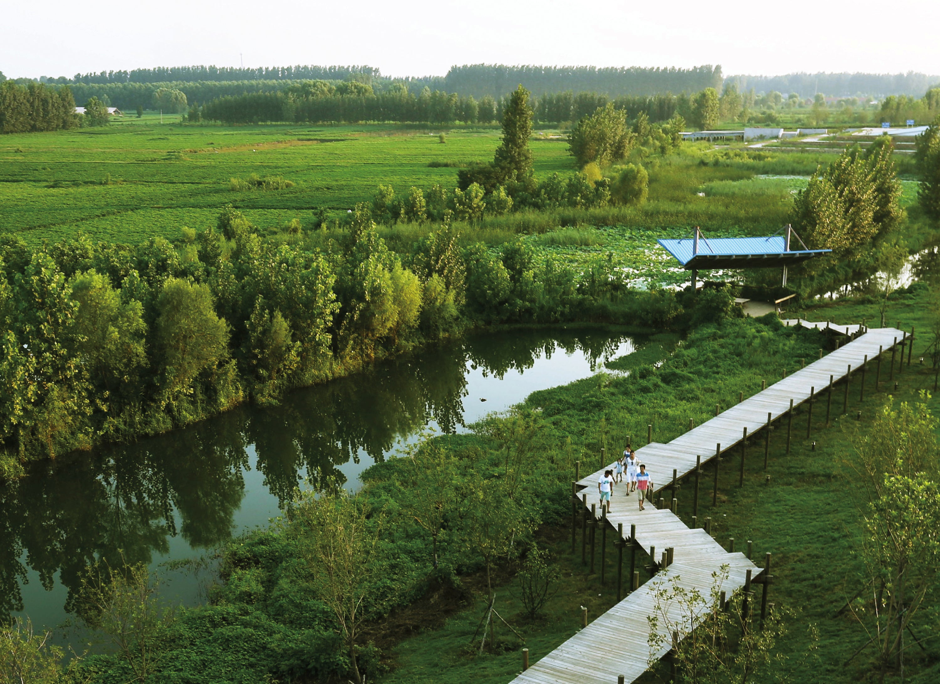 The first phase of the Weishan Wetland Park in the town of Jining in China’s Shandong Province was completed in 2013. The impetus for this 39-square-kilometer (15-square-mile) park was the adjacent development of a new urban center just south of the existing city of Weishan, near the southeastern edge of the expansive Nansi Lake (also called Weishan Lake). This new southern town will eventually have 50,000 residents in an area that was previously agricultural. The Weishan Wetland Park will filter polluted water from the future development, and it is hoped that it will be the centerpiece of a larger program of nature-based tourism in the region. The proximity to Nansi Lake, one of the country’s largest and most polluted lakes, makes the park’s purification function especially important, as the lake is a part of China’s ambitious, though ecologically and socially disruptive, South-North Water Diversion Project, which redirects fresh water from the Yangtze River in the south to the more arid Yellow River basin in the north.